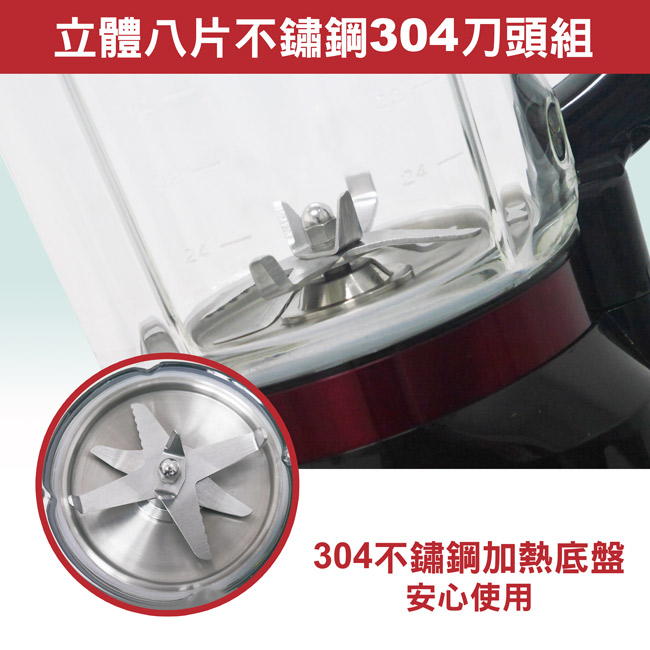 智慧微電腦觸控螢幕,2公升強化耐高溫加厚玻璃杯,立體八片不鏽鋼304刀頭組,厚底防滑腳墊,止滑、減震、低噪音,料理好幫手